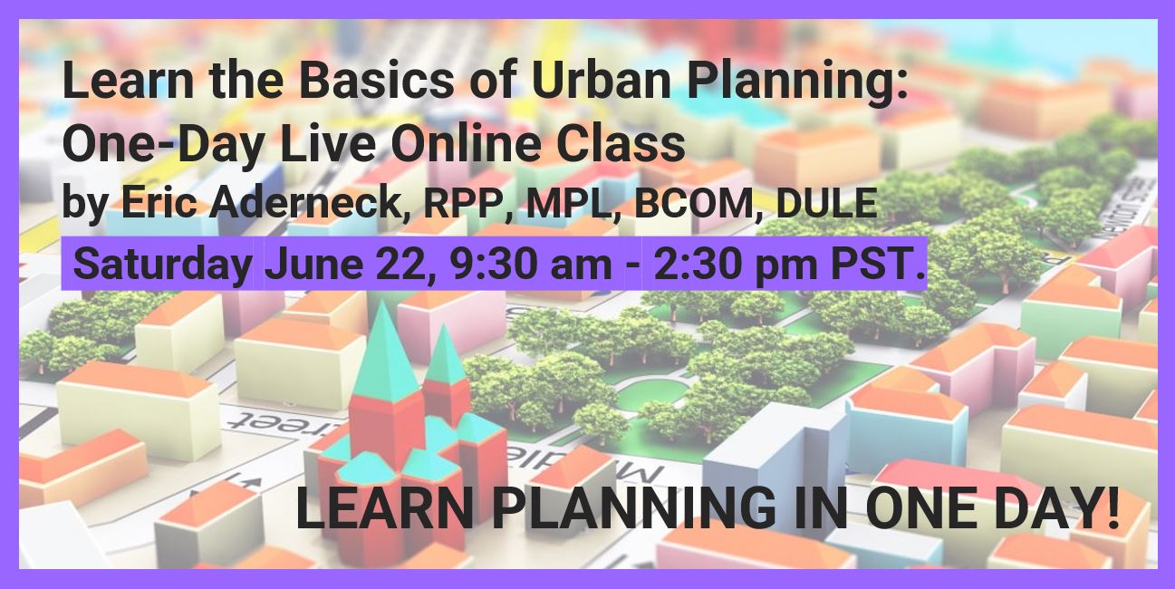 Learn the Basics of Urban Planning: One-Day Live Online Class, Saturday June 22, 9:30 am to 2:30 pm: https://www.eventbrite.ca/e/learn-the-basics-of-urban-planning-one-day-l...