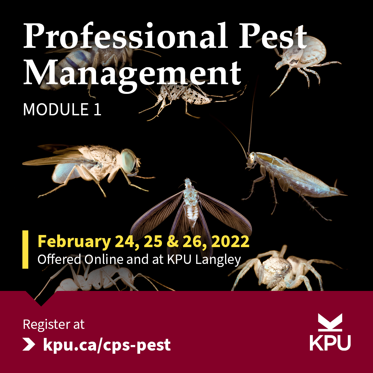 Kwantlen Polytechnic University’s School of Horticulture is offering the Professional Pest Management (PPM) Module 1 online February 24-26, 2022. This training is designed to provide up-to-date training in the technical aspects of pest management, quality assurance, and customer care to upgrade your professional industry development or meet continuing education (CE) credit requirements.